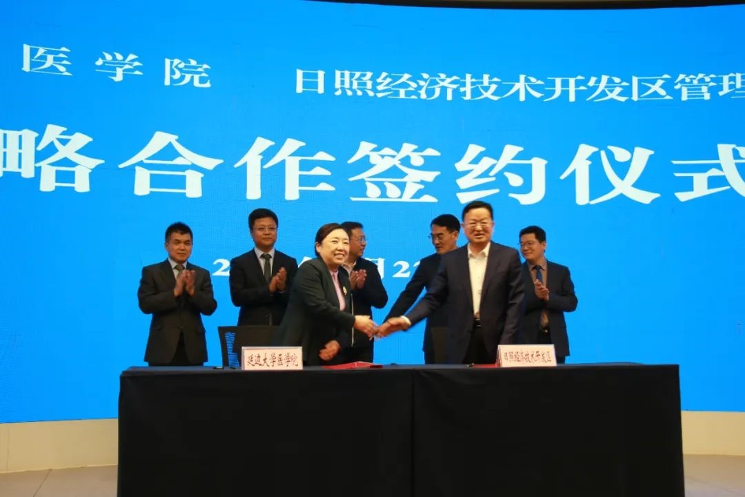 仪式上,学院领导与日照华洋白求恩医院、日照经开区领导签署合作协议。双方将围绕提高医疗水平和临床科研能力等方面开展合作,实现互惠共赢、共同发展。